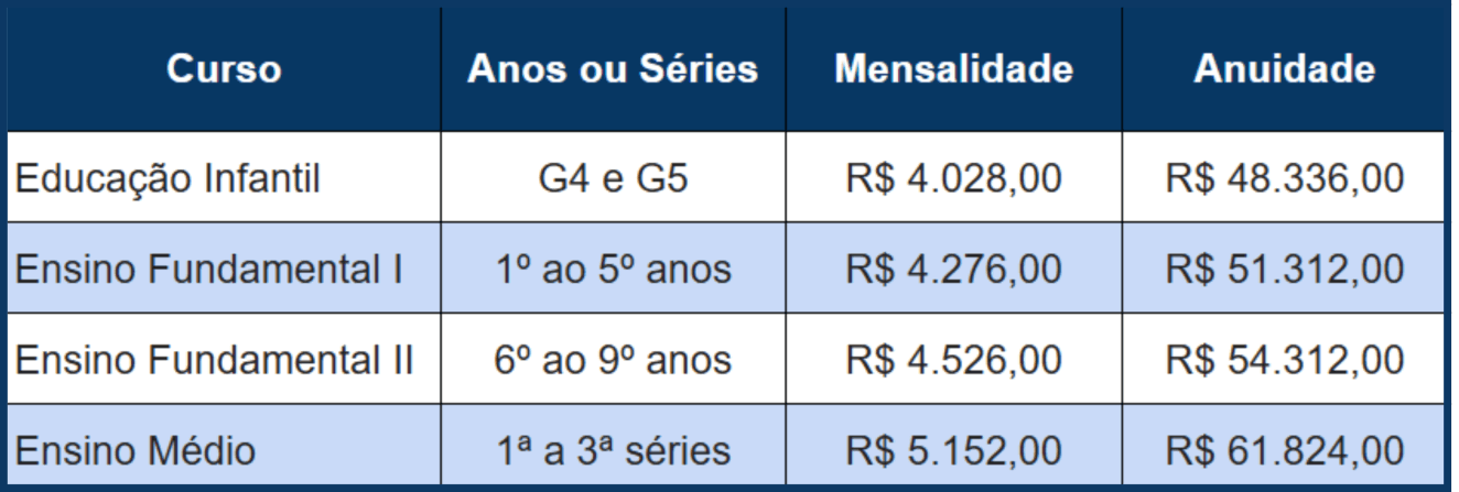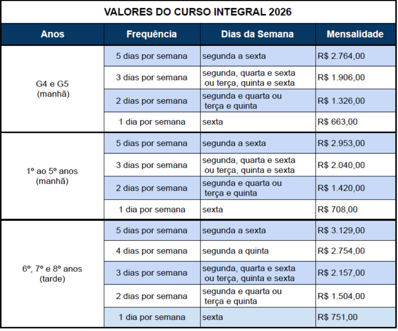 O valor a ser pago na matrícula para ALUNOS NOVOS corresponderá à primeira mensalidade de 2026. A segunda mensalidade, de mesmo valor que a primeira, será paga em 10 DE FEVEREIRO de 2026.