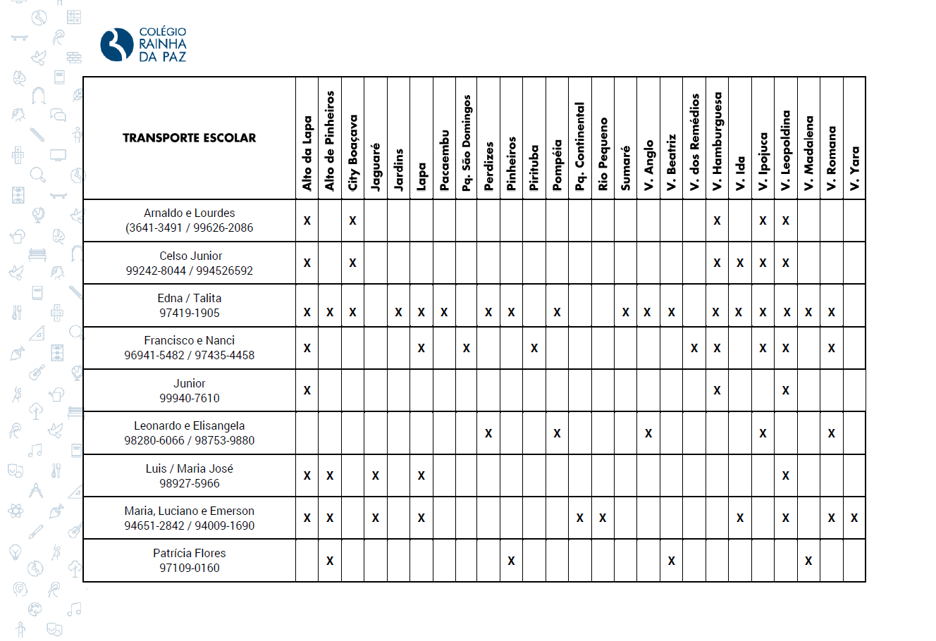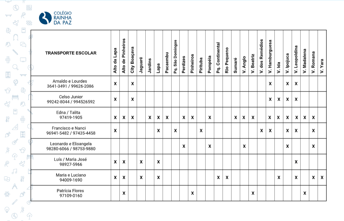 Não possuimos ônibus e nenhum vínculo com as empresas de transporte escolar. Abaixo constam os nomes das empresas que têm atendido nossas famílias nos últimos anos. Ao optar por alguma dessas empresas, cabe ao responsável informar a escola para que possamos controlar a entrada e saída dos alunos. Caso haja qualquer mudança no decorrer do ano, pedimos também que nos comuniquem. A avaliação da eficiência desse serviço fica a cargo da família.
